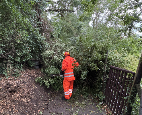 Nach Erkundung wurde der Baum mittels Motorkettensäge zersägt und am Straßenrand abgelegt.